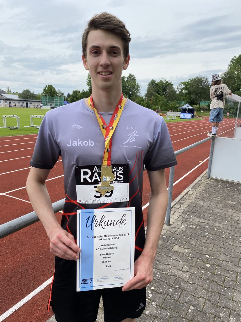 Nach 11:00 Uhr ging es dann für Jakob Baufeld an die erste von 3 Disziplinen. Er startete mit den 110m Hürden bevor es direkt im Anschluss zur Titelverteidigung (1,86m, wir berichteten) an die Hochsprunganlage ging. Jakob setzte sich über die 110m Hürden gegen seine Konkurrenz durch und wurde mit 16,76s Schwäbischer Meister. Bei der Titelverteidigung von Hochsprung war er leider jedoch nicht so erfolgreich und wurde mit 1,76m Zweitplatzierter.