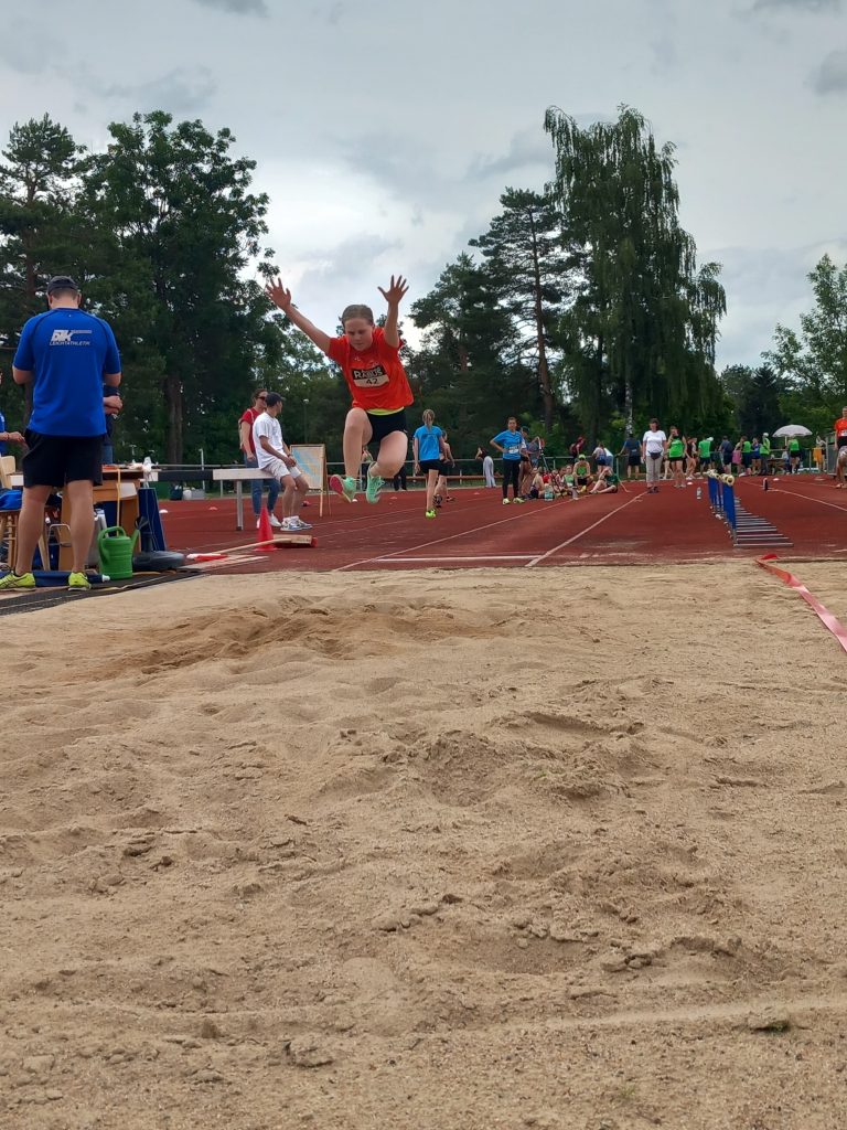 Erneut direkt im Anschluss ohne Pause ging es diesmal für Mia weiter an den Hochsprung. Dort überflog sie die Anfangshöhe von 1,10m mit Bravour und steigerte sich auch erfolgreich über die 1,18m hoch. Die 1,22m hat sie nur knapp verpasst, das will sie aber auf dem nächsten Wettkampf nachholen. Clara Tiemeyer meisterte trotz geringer Wettkampf und Hochsprung Erfahrung die 1,10m auf den ersten Versuch.