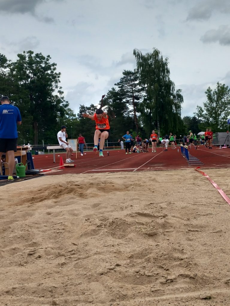Weiter ging es um 13:40 Uhr mit dem Weitsprung. Philomena sprang mit 3,51m auf den 14. Platz von 28 Teilnehmerinnen. Dahinter Lisa mit 3,43m und Neele mit 3,25m.